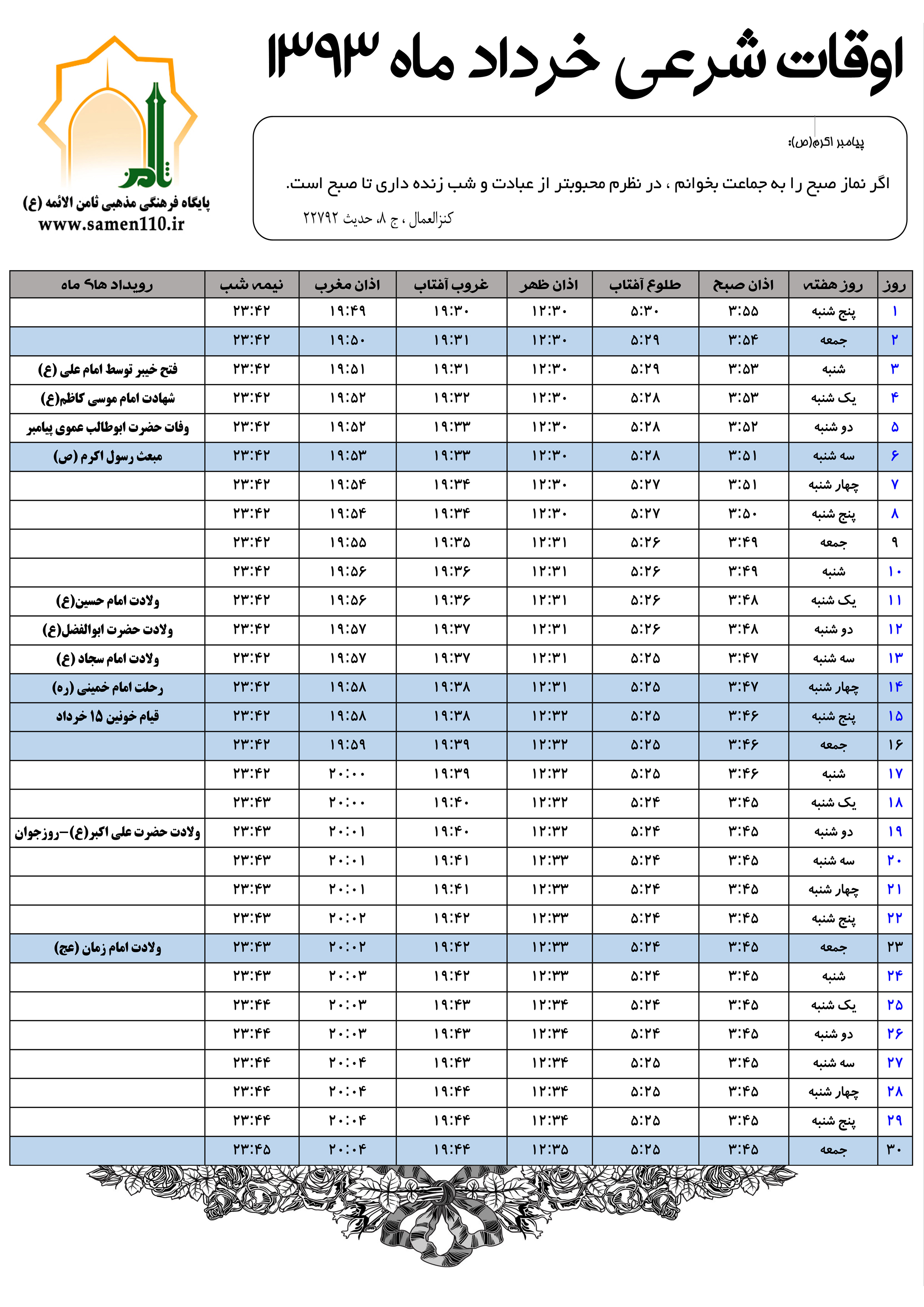 اوقات شرعی خرداد ماه 1393 شهر بیرجند را از آدرس زیر میتوانید دانلود کنید: